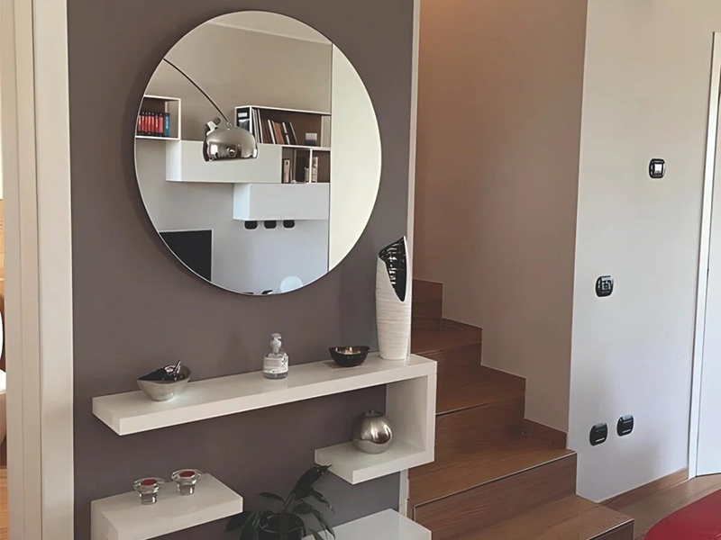 Dekorativno ogledalo 45 cm sastoji se od bele ploče držača 18 mm za ogledalo koje je istog prečnika,na poleđini je sistem kačenja.