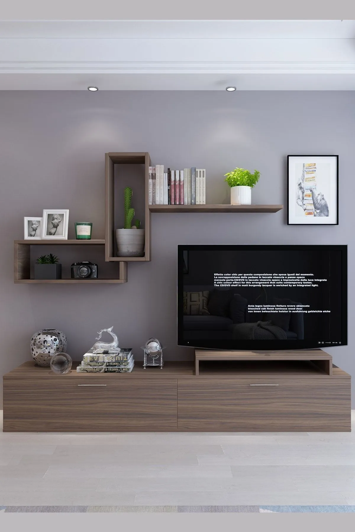 Elegantna i moderna komoda sa zidnom policom predstavlja upečatljiv komplet dnevnog boravka.